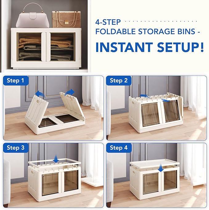 - Instant Foldable Storage Bins With 3 Lids: Each storage bin can be used independently or stacked upwards. These 228 QT collapsible storage bins with lids require no tools for installation and can be ready for use in as little as 10 seconds. When not needed, they can be easily folded and stored under the bed or couch or in any corner, taking up very little space.