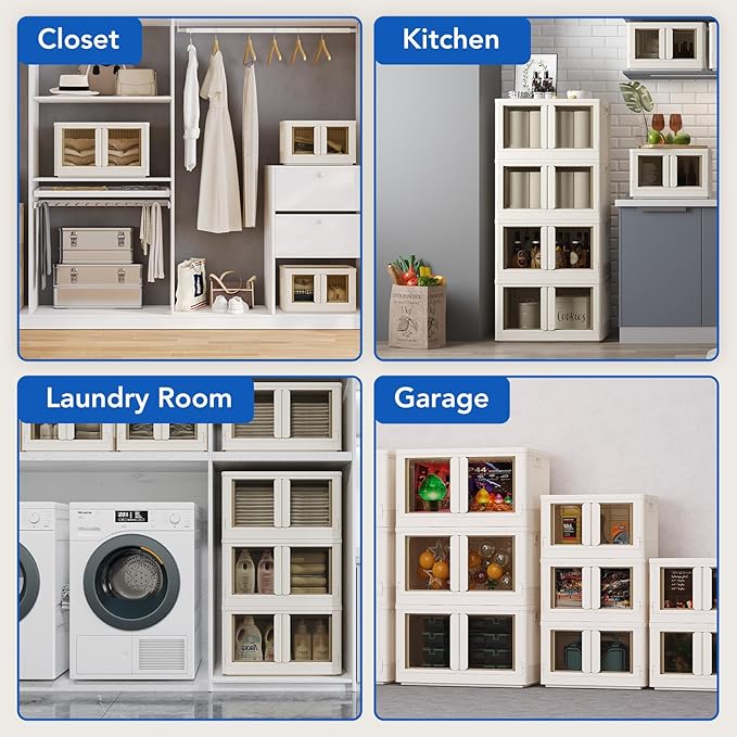 FLEXIMOUNTS 228 QT Stackable Storage Bins With Lids, Collapsible Plastic Storage Bins With Doors and Built-in Wheels For Home Dorm Closet Organizers and Storage, 3 Pack Cubes, Milky White