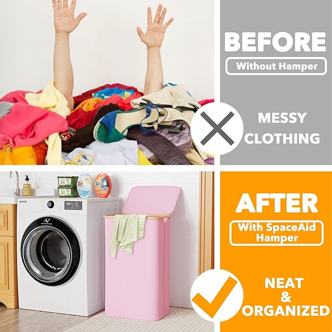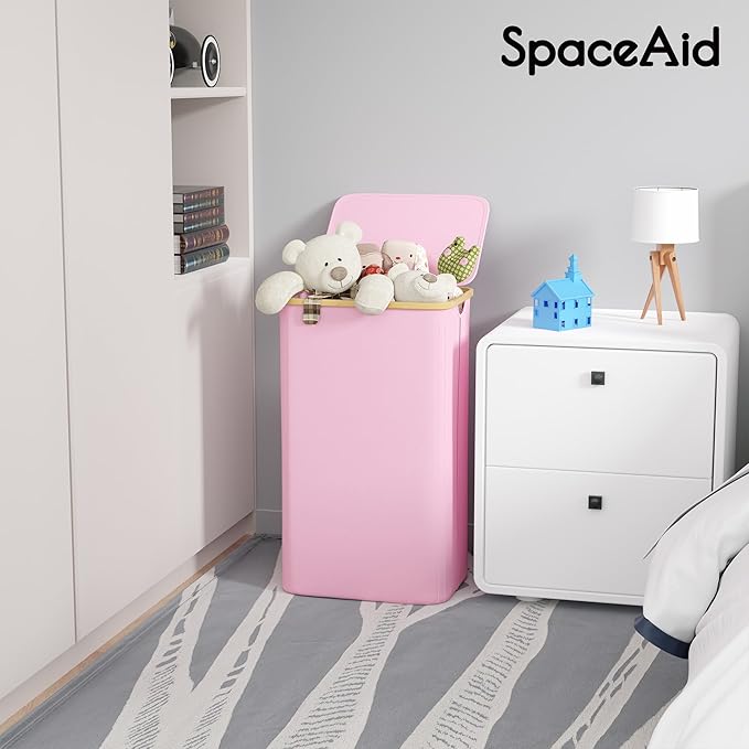 SpaceAid Laundry Hamper with Lid, 110L Large Tall Clothes Basket Bin with Bamboo Handles, Collapsible Laundry Hamper for Bedroom, Bathroom, Dorm, Laundry Room - Pink