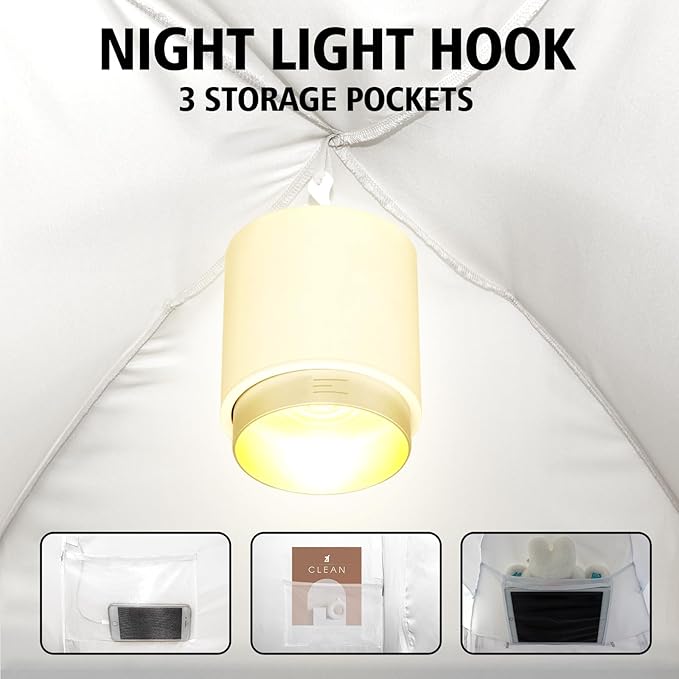 • Multifunction: Inside the bed tent, you'll find 3 storage pockets, an iPad pocket, 2 charging ports, and a night light hook at the top in the middle, each corner with djustable buckle, and the whole floor sits under the mattress-no slip!