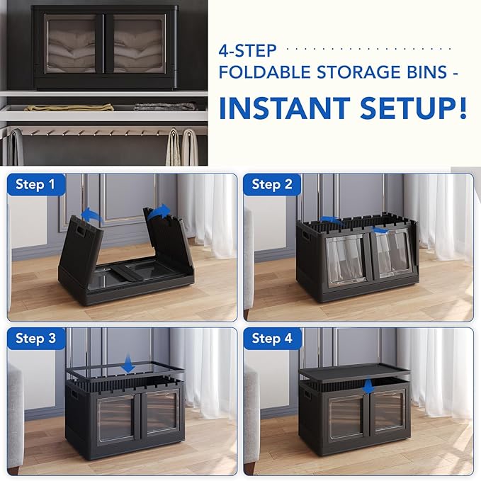 - Instant Foldable Storage Bins With 2 Lids: Each storage bin can be used independently. These 152 QT collapsible storage bins with lids require no tools for installation and can be ready for use in as little as 10 seconds. When not needed, they can be easily folded and stored under the bed or couch or in any corner, taking up very little space.