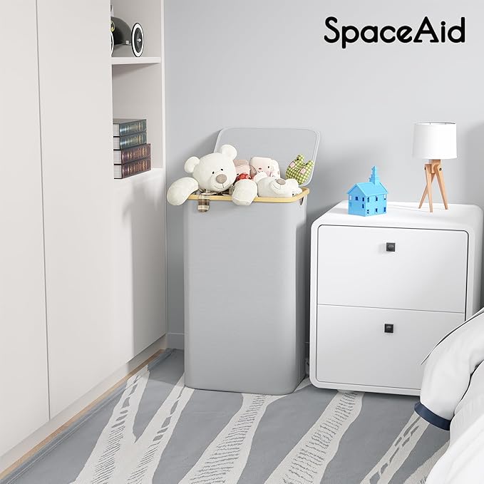 SpaceAid Laundry Hamper with Lid, 110L Large Tall Clothes Basket Bin with Bamboo Handles, Collapsible Laundry Hamper for Bedroom, Bathroom, Dorm, Laundry Room - Light Grey