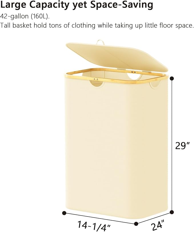 - Large Capacity yet Space-Saving: Measures 19-1/2” x 14-1/4” x 29”, 34-gallon (160L) capacity and 2 section. Tall basket hold tons of clothing while taking up little floor space. Bamboo matching cloth design is a perfect addon to your bedroom, laundry room, bathroom, college dorm, or kid room's decor.