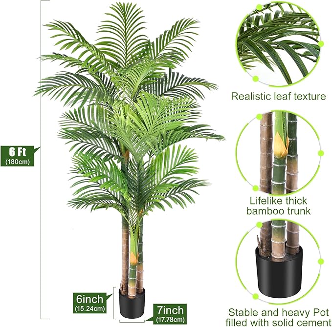 - This 6 feet majestic triple tropical golden cane palm artificial tree has 24 large vivid fronds filled with countless arching feather-like leaves with realistic palm texture, three lifelike bamboo trunks are very strong, it looks so lush and great, it will create a tropical paradise atmosphere for you and those around you, now this extra tall triple cane palm tree is waiting to dance in the warm tropical breezes
