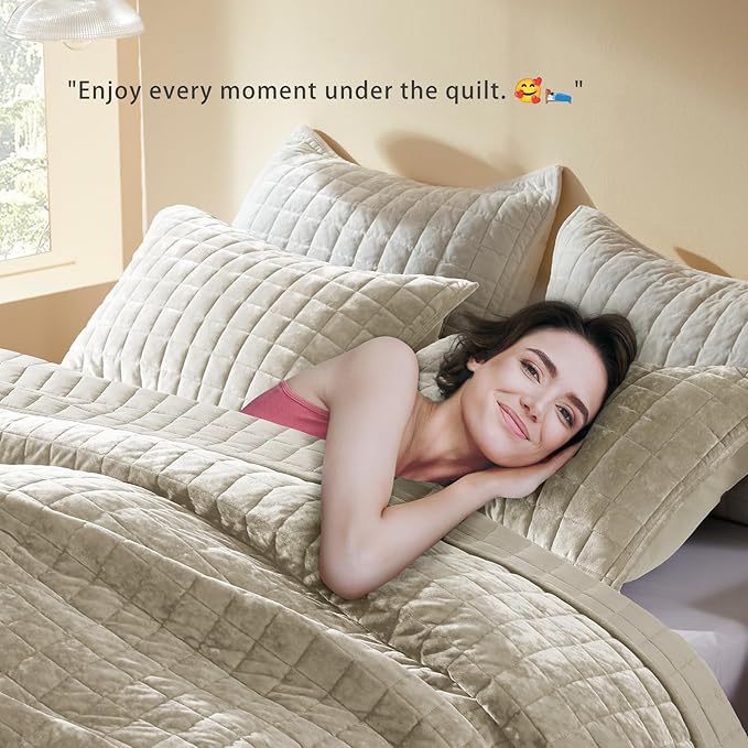 LEAONME Velvet Quilt California King-118''x106'', Lightweight Beige Velvet Comforter Set with 2 Pillow Shams, Soft Oversized Bedspread Coverlet Quilted Bedding Set for All Season
