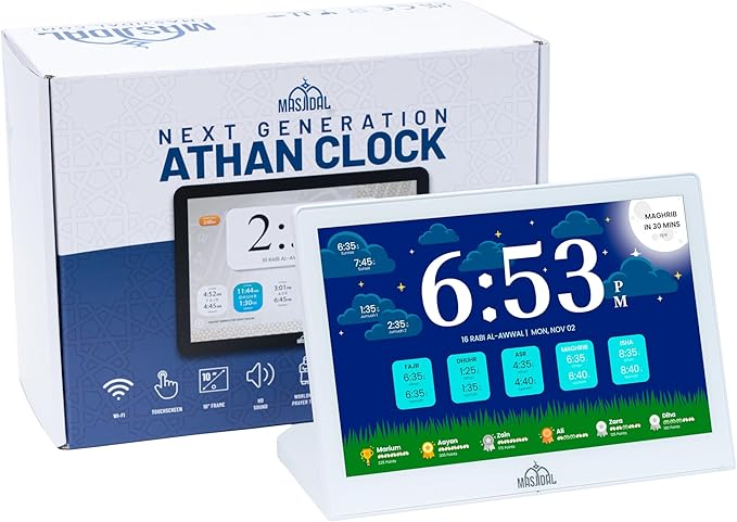 - GORGEOUS DYNAMIC SCREEN: Our azaan screen is packed with the latest technology resulting in a booming Islamic call to prayer that fills your home and a pixel-perfect screen that shows inspiring Islamic art on rotation.